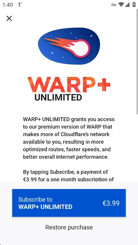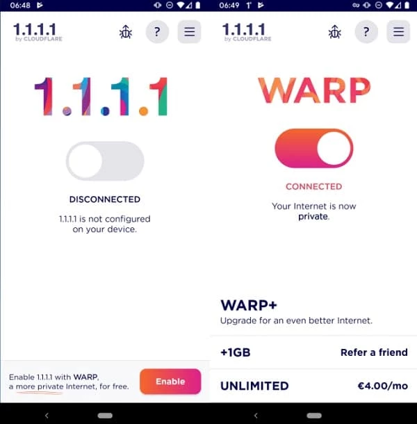 Die DNS- und WRAP-Dienste mit allen Basisfunktionen können Sie kostenlos nutzen. Für Premium-Bandbreite über das Argo-Netzwerk von Cloudflare können Sie auf WRAP+ upgraden. Dieser Dienst bietet Ihnen unter anderem staufreie Routen und eine bis zu 30 % höhere Geschwindigkeit. Die Zahlung erfolgt monatlich über Google Play .